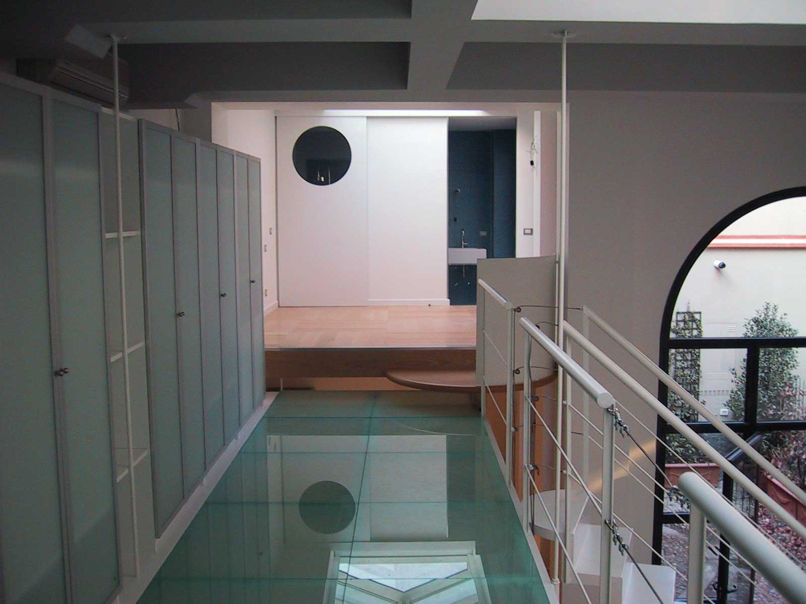 Loft nella zona delle ex Varesine. Ristrutturazione di un intero stabile fatiscente. Un edificio in disuso da tempo, all’interno del cortile, diventa un affascinante ambiente con pochi interventi essenziali: un blocco su due piani con una scala e una passerella trasparente uniscono la zona giorno con quella notte.